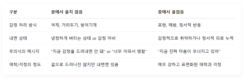 - 스트레스 해소의 작용: 실제로는 울지 못하는 상황에서 꿈속에서는 마음껏 울며 감정을 해소하려는 무의식의 작용일 수도 있어요.